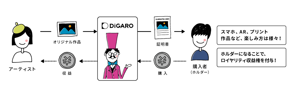 DiGAROからグッズやプリント作品などが購入されると、アーティストと応援者であるマスター作品の所有者(ホルダー)様に収益が還元される仕組みになっています。